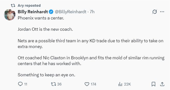 根据太阳记者Billy Reinhardt的报道,太阳想要补强的对象是一个中锋,乔丹-奥特是一个新教练,篮网可能是杜兰特交易的第三方,奥特在布鲁克林执教时与克拉克斯顿交情匪浅,他很契合奥特的战术。
