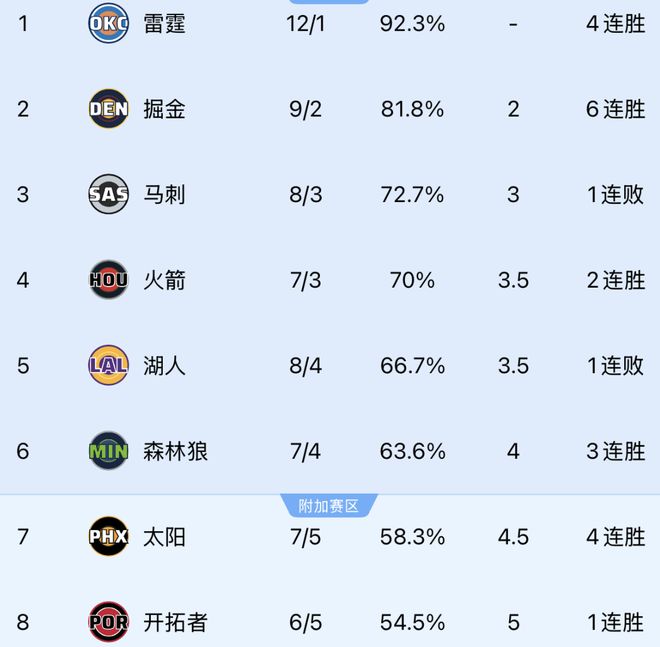 随着掘金送快船6连败,湖人惨败雷霆,勇士大逆转,西部排行更新